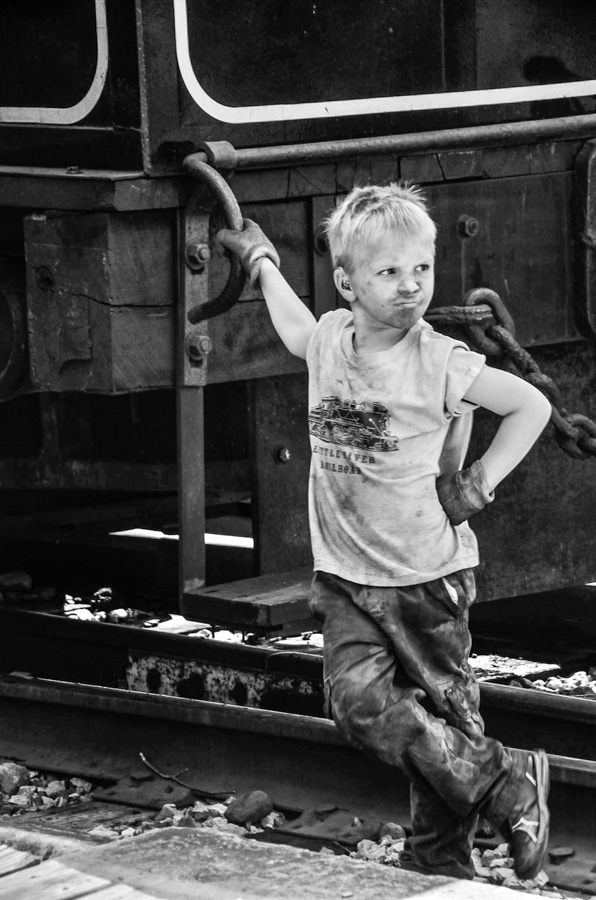 Janice took her grandson for a ride on this boy’s train and there he was. She posted a color version, too. For me, it was a no-brainer…of course. There are so many great things to appreciate here that make it all come together—his Casey Jones body language, the darkness of the train behind him, his face, the DIRT on his face.