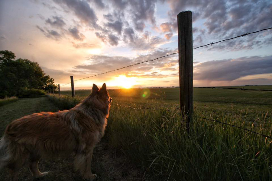 Obviously, I don’t need to explain the power of the lighting here. But here’s something that Kim did right here— and I must say that she does it right almost all the time. She has nailed the exposure. She has held detail in that sky and by whatever method held some detail in the dark areas of the grass and the dog. (Pictures like this start with not overexposing the sky and then brightening up the shadows in editing. That is a powerful formula.)