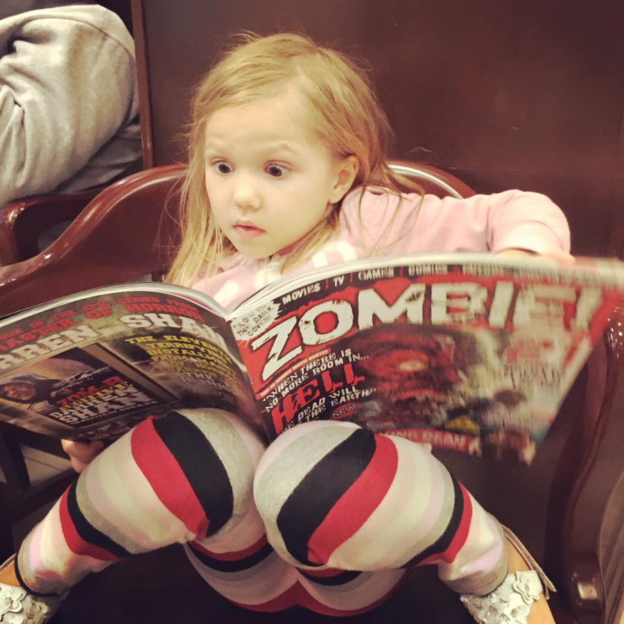 Who would’ve ever thought that when she put those tights/pajama bottoms on that morning they would somehow color coordinate with a copy of Zombie Magazine at the comic book store?