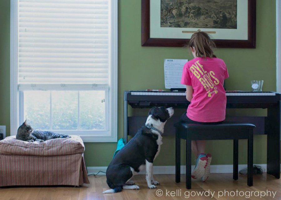 It’s a little difficult to not think of Nipper, the RCA dog, here… His Master’s Voice…you know the one. But Kelli kept her eyes open and her feet on the ground and included a feline, too. It’s totally a relationship picture. It’s worth studying this composition; notice how she’s used all the rectangles in this photograph to bind the image together. The way she’s cropped the window and the ottoman and the picture frame— all of those horizontal and vertical lines completely work with the diagonal of the dog’s body which directs us to our pianist. The more you study this picture, I think, the more lessons you will learn about composition.