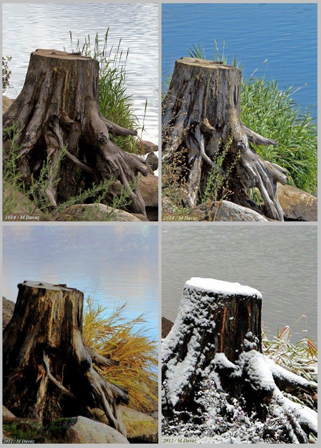 I've photographed this stump from many angles ... when the water level is low, I climb down the short cliff and photograph the stump from below ... in the early Autumn when the kids are back in school, I've found balled up socks left to dry on the stump."